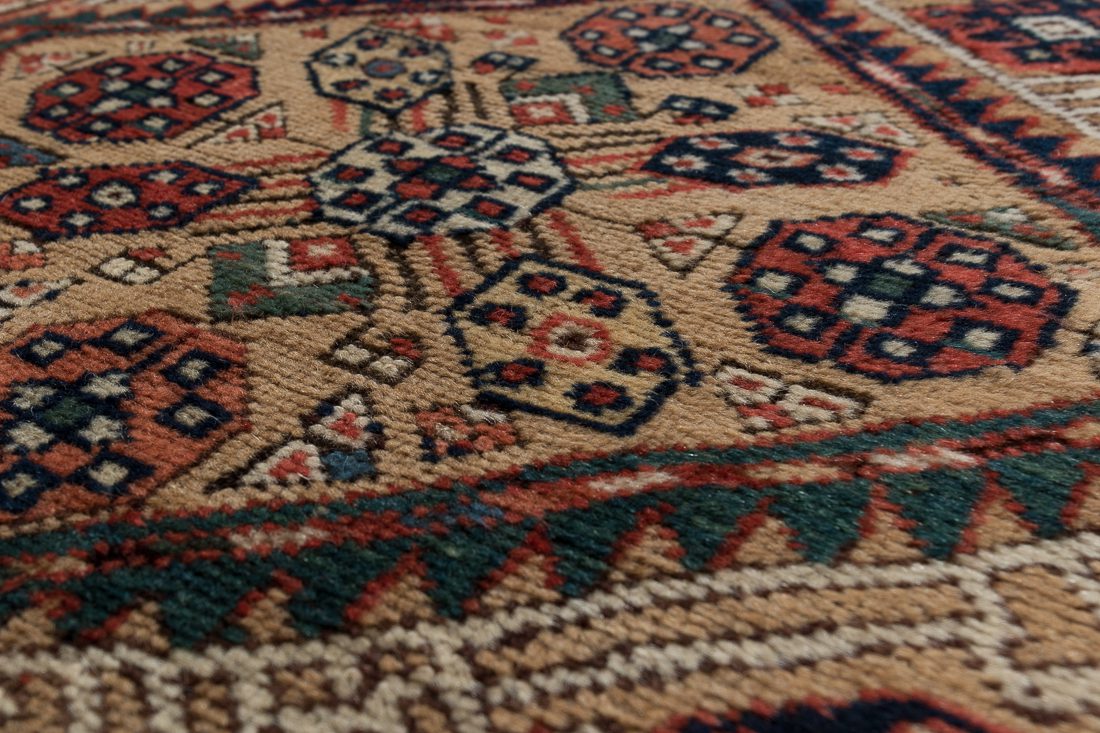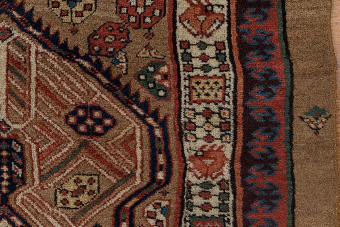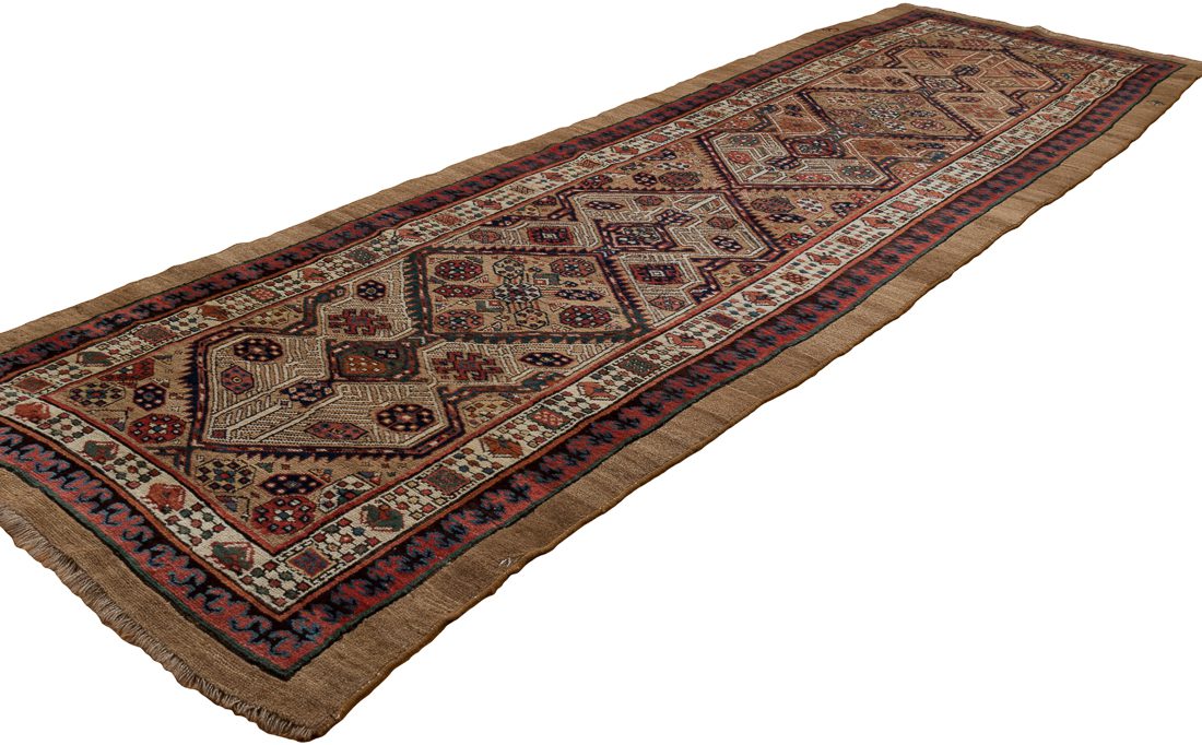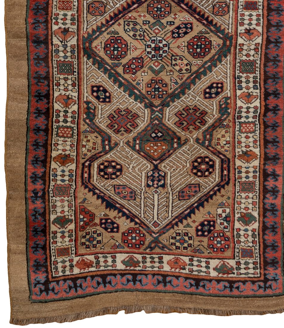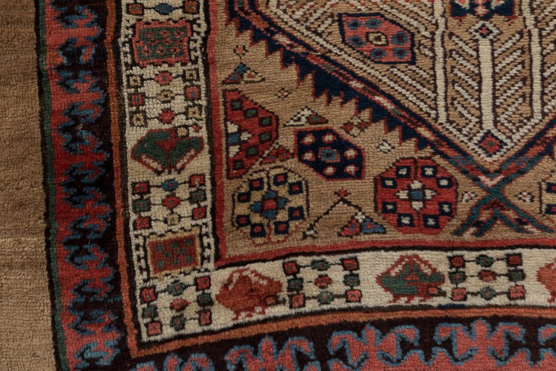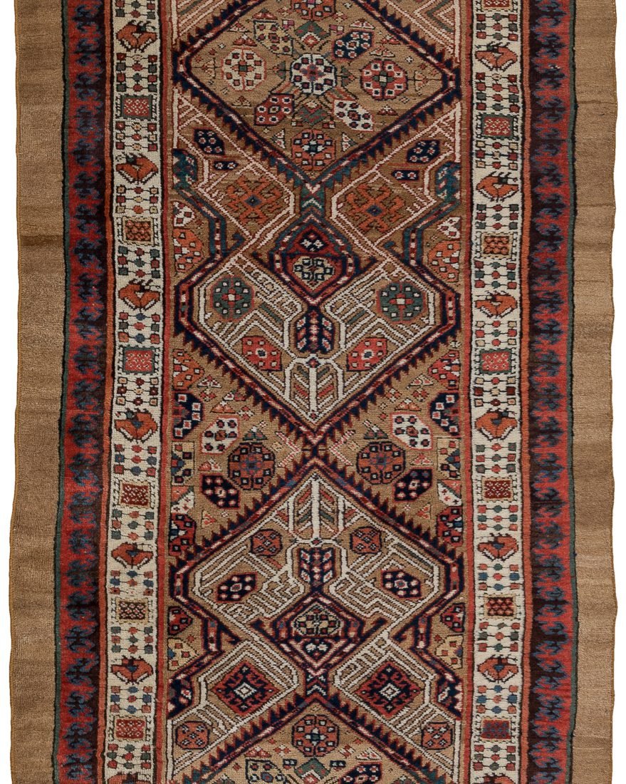 This beautiful piece was woven circa 1890–1910 by nomadic or semi-nomadic weavers. Tribal weavings, especially from the Northwest region near the Caucasus, are celebrated for their bold, rectilinear patterns, reflecting influences from various ethnic groups and the personal imagination of the weaver, who worked from memory rather than a complex diagram. The wool warp foundation is a classic structural sign of these durable, nomadic weavings, built to withstand a rugged lifestyle. Featuring a striking, repeating pattern of geometric medallions and a palette rich in saturated, natural dyes, this runner is a cherished, authentic piece of Persian folk art that offers both history and enduring character.