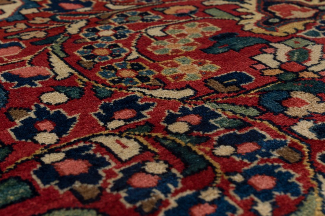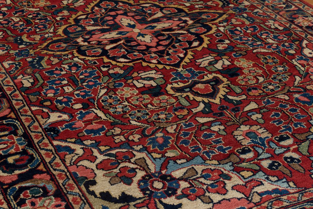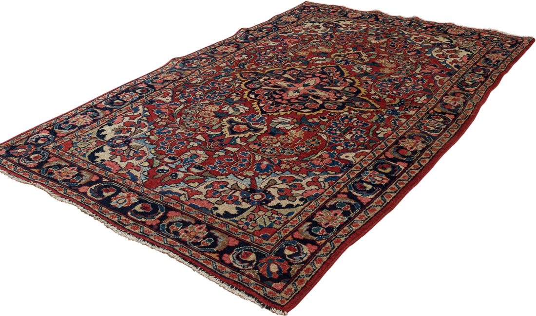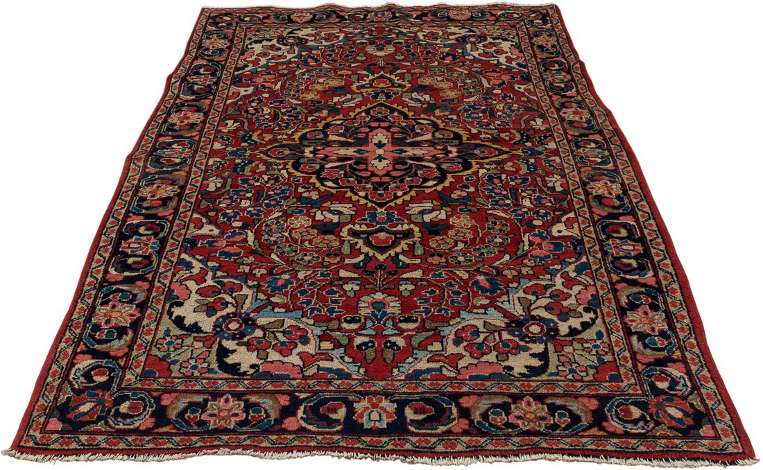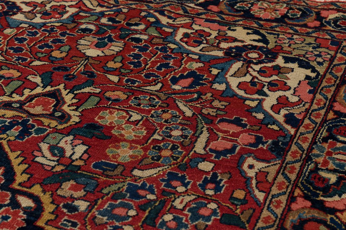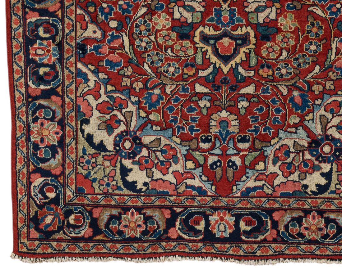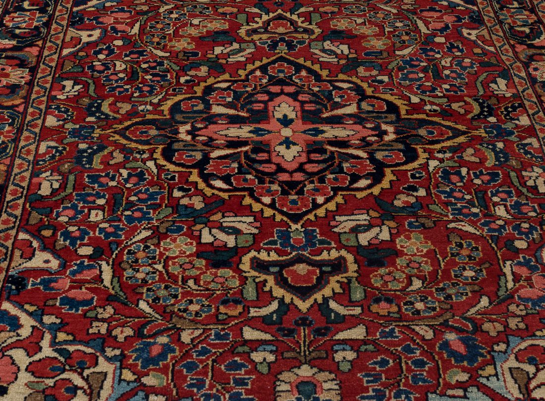 This Sarouk rug was hand-knotted in the Arak region of Iran, likely between 1925 and 1935. A definitive example of the “American Sarouk” style, it is characterized by its heavy, double-wefted construction and a deep, saturated rose field decorated with detached floral bouquets. While many rugs from this period feature open fields, this piece is distinguished by its prominent central medallion containing a distinct cruciform star—a motif more commonly seen in village Lilihans but here executed with the superior density and weight of a Sarouk weave. Its thick wool pile and grounded navy borders make it a highly durable specimen of early 20th-century Persian workshop craftsmanship.