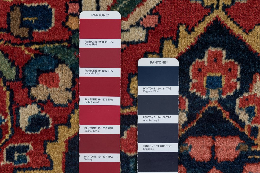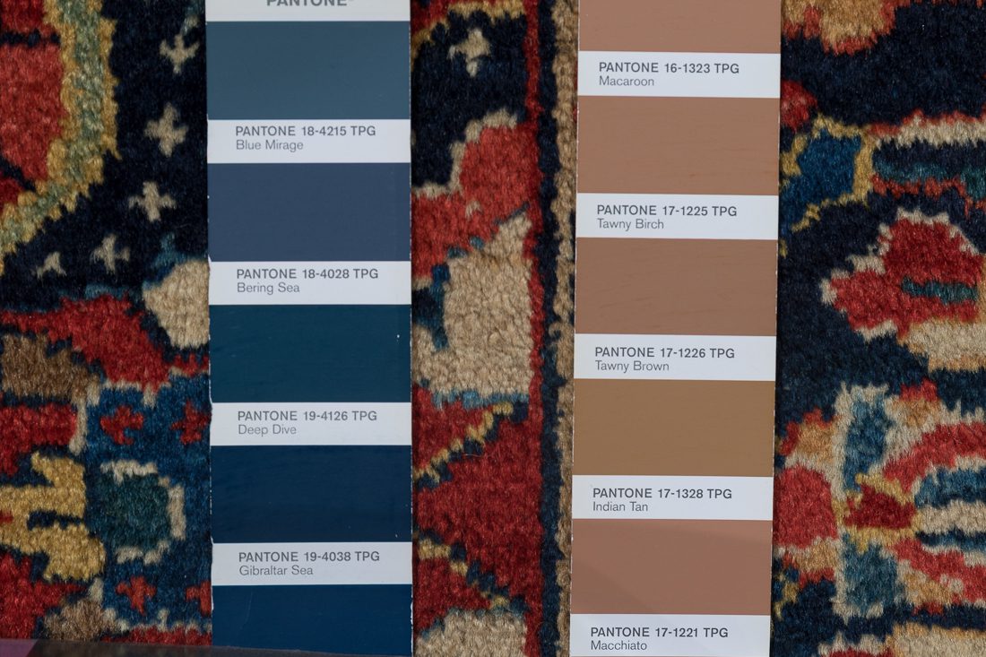 PANTONE shades: We do our best to find the closest match to one or multiple colors in the rug. The shade card we choose may not always be the perfect one, but we do our best (it’s a lot of work)! At times we may show multiple shade cards so you can get a better sense of color. Finally, when photographing rugs from the same group (shipment, collection, SKU, etc.) we will often use one or two shade card(s) so that you can get a good sense of the coloration. Hope you enjoy viewing our beautiful rugs!