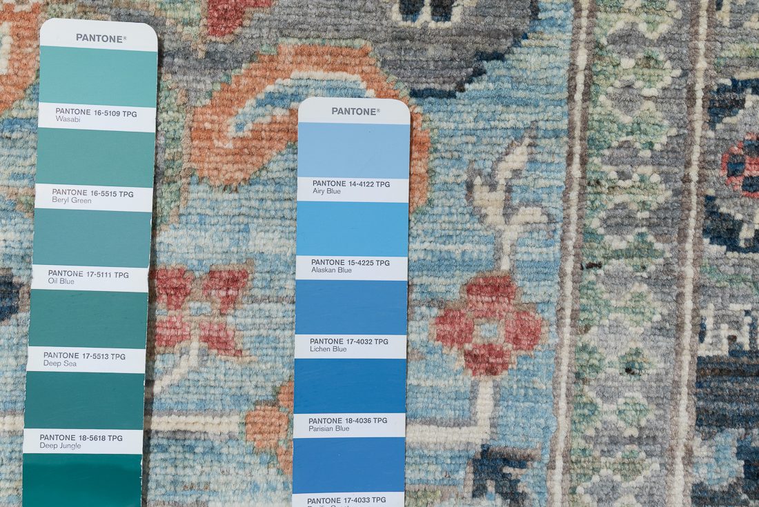 PANTONE shades: We do our best to find the closest match to one or multiple colors in the rug. The shade card we choose may not always be the perfect one, but we do our best (it’s a lot of work)! At times we may show multiple shade cards so you can get a better sense of color. Finally, when photographing rugs from the same group (shipment, collection, SKU, etc.) we will often use one or two shade card(s) so that you can get a good sense of the coloration. Hope you enjoy viewing our beautiful rugs!