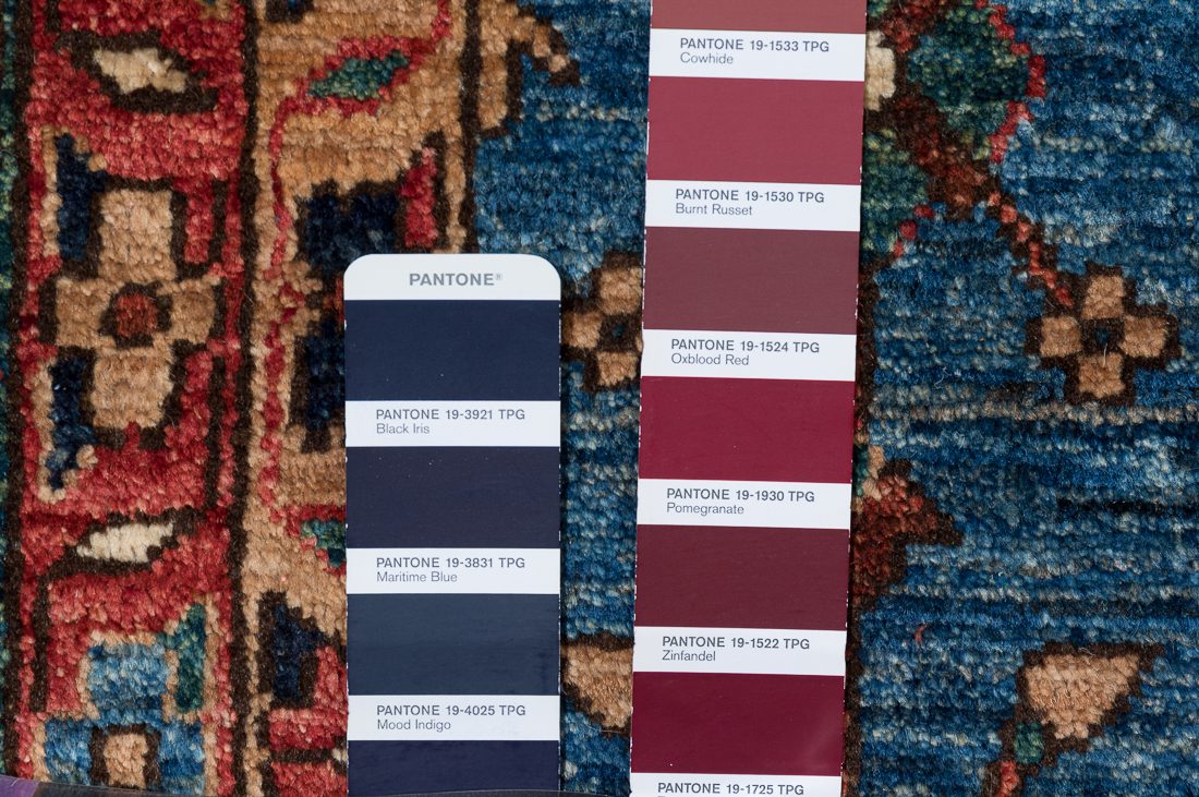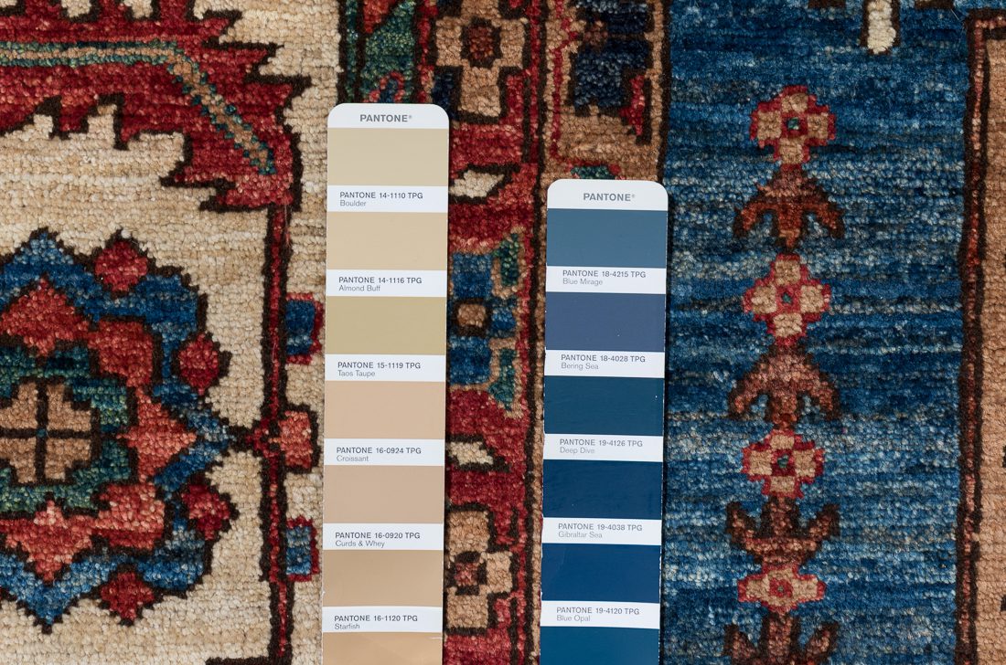 PANTONE shades: We do our best to find the closest match to one or multiple colors in the rug. The shade card we choose may not always be the perfect one, but we do our best (it’s a lot of work)! At times we may show multiple shade cards so you can get a better sense of color. Finally, when photographing rugs from the same group (shipment, collection, SKU, etc.) we will often use one or two shade card(s) so that you can get a good sense of the coloration. Hope you enjoy viewing our beautiful rugs!