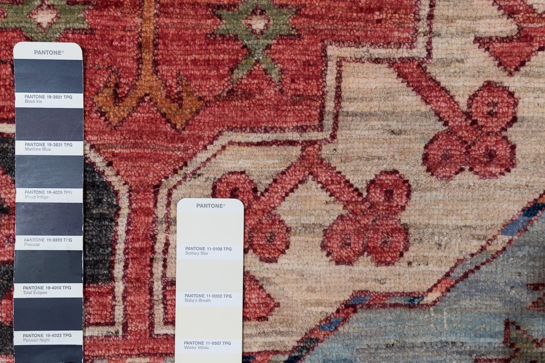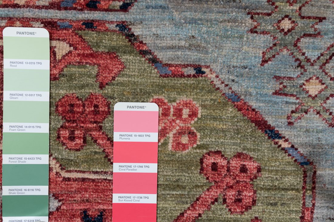 PANTONE shades: We do our best to find the closest match to one or multiple colors in the rug. The shade card we choose may not always be the perfect one, but we do our best (it’s a lot of work)! At times we may show multiple shade cards so you can get a better sense of color. Finally, when photographing rugs from the same group (shipment, collection, SKU, etc.) we will often use one or two shade card(s) so that you can get a good sense of the coloration. Hope you enjoy viewing our beautiful rugs!