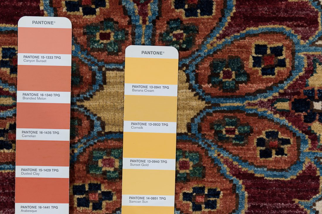 PANTONE shades: We do our best to find the closest match to one or multiple colors in the rug. The shade card we choose may not always be the perfect one, but we do our best (it’s a lot of work)! At times we may show multiple shade cards so you can get a better sense of color. Finally, when photographing rugs from the same group (shipment, collection, SKU, etc.) we will often use one or two shade card(s) so that you can get a good sense of the coloration. Hope you enjoy viewing our beautiful rugs!