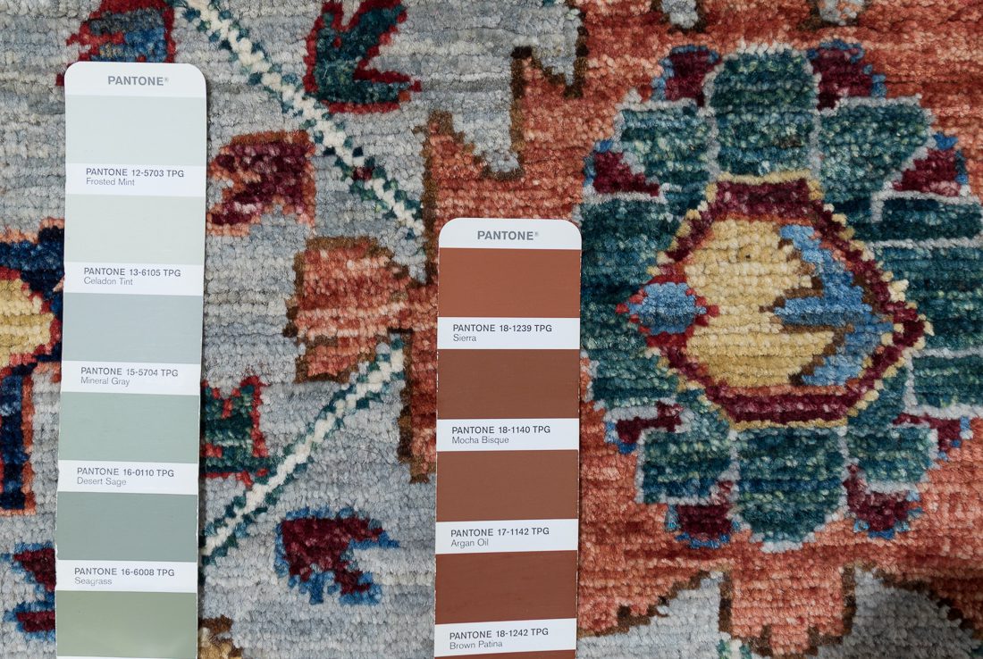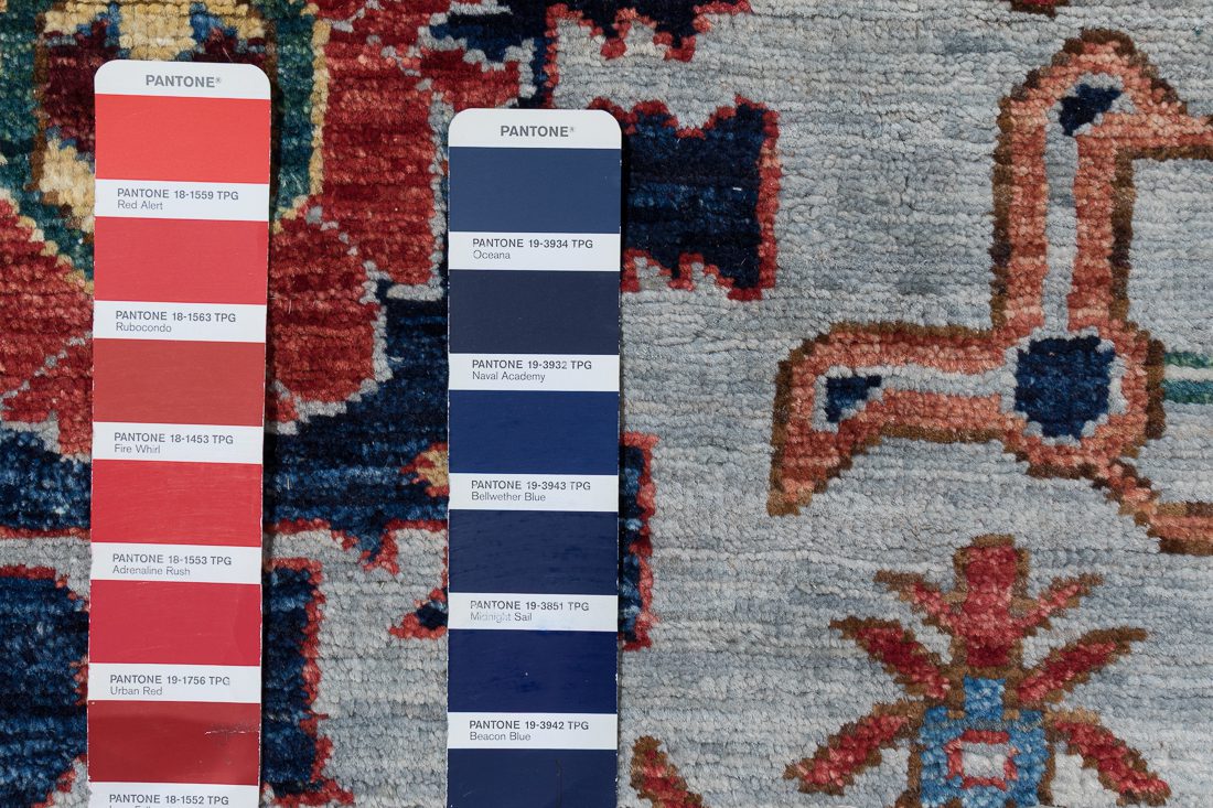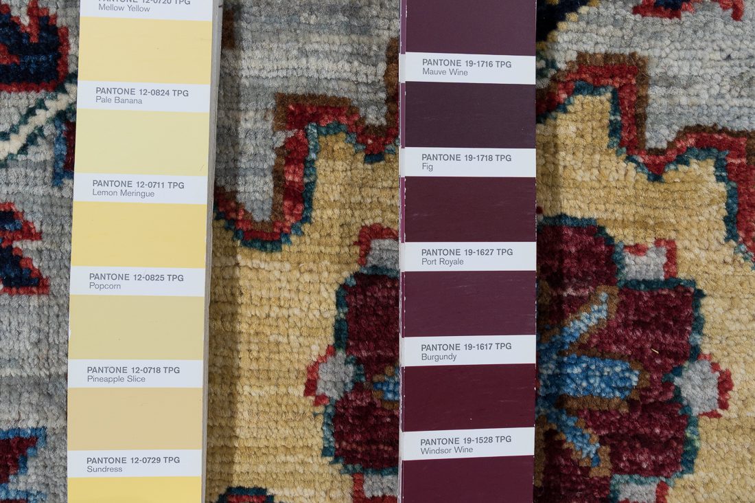 PANTONE shades: We do our best to find the closest match to one or multiple colors in the rug. The shade card we choose may not always be the perfect one, but we do our best (it’s a lot of work)! At times we may show multiple shade cards so you can get a better sense of color. Finally, when photographing rugs from the same group (shipment, collection, SKU, etc.) we will often use one or two shade card(s) so that you can get a good sense of the coloration. Hope you enjoy viewing our beautiful rugs!