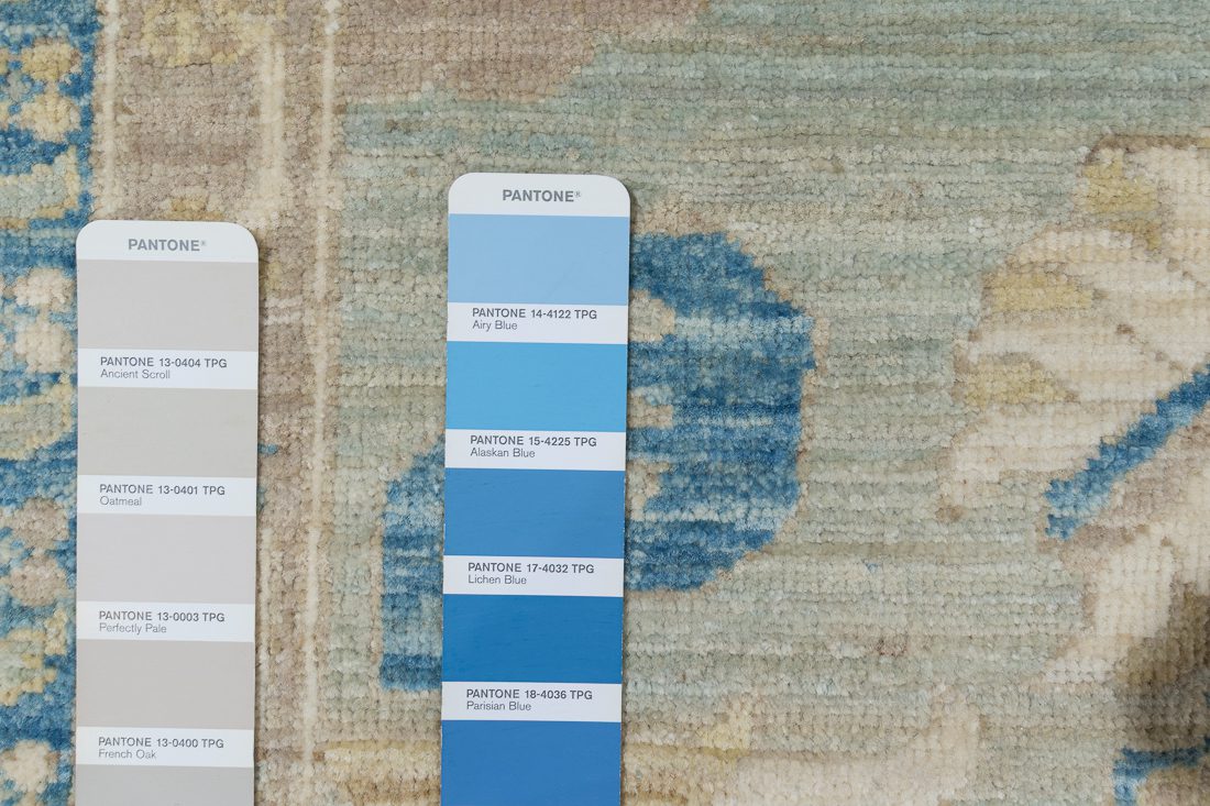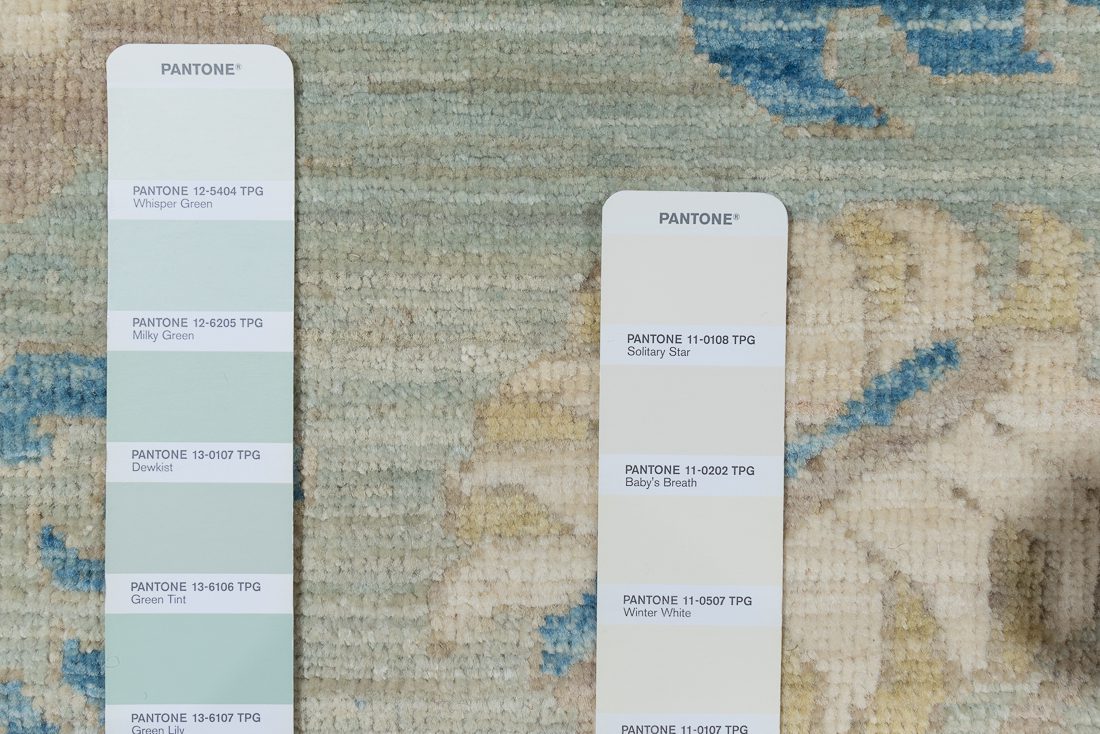 PANTONE shades: We do our best to find the closest match to one or multiple colors in the rug. The shade card we choose may not always be the perfect one, but we do our best (it’s a lot of work)! At times we may show multiple shade cards so you can get a better sense of color. Finally, when photographing rugs from the same group (shipment, collection, SKU, etc.) we will often use one or two shade card(s) so that you can get a good sense of the coloration. Hope you enjoy viewing our beautiful rugs!