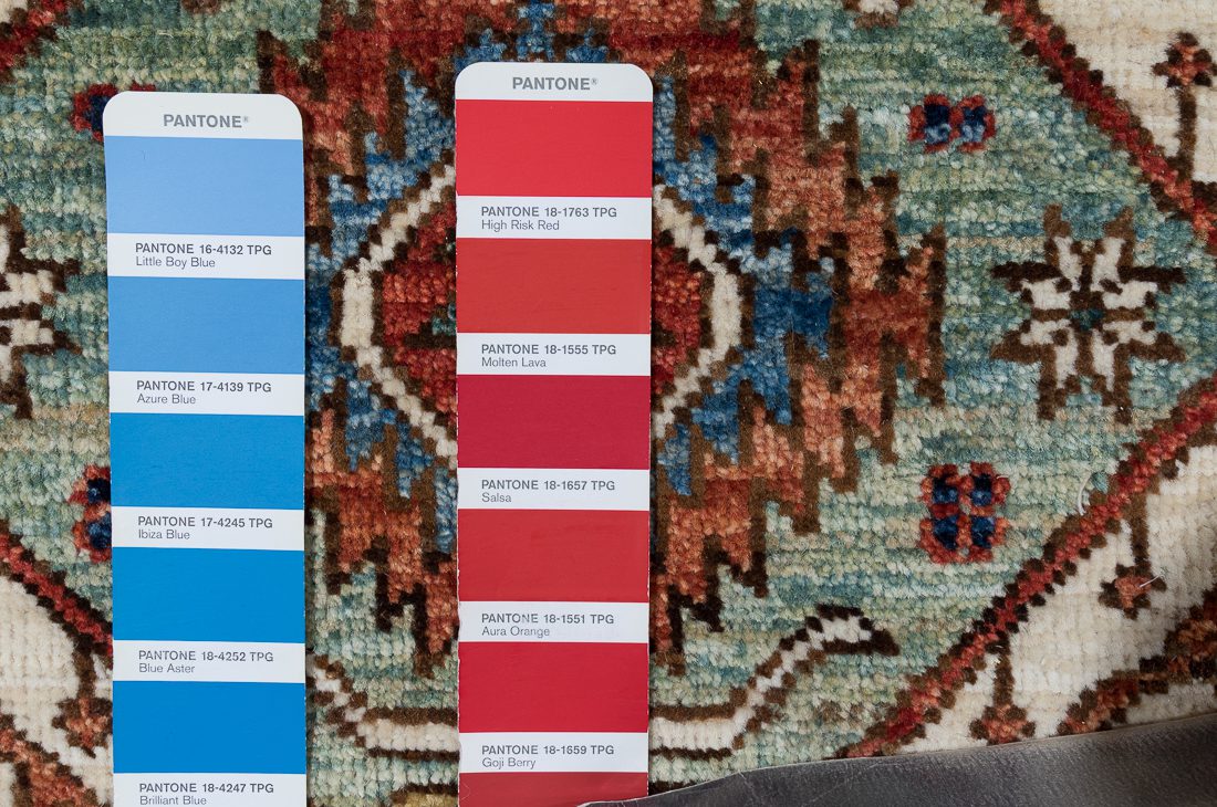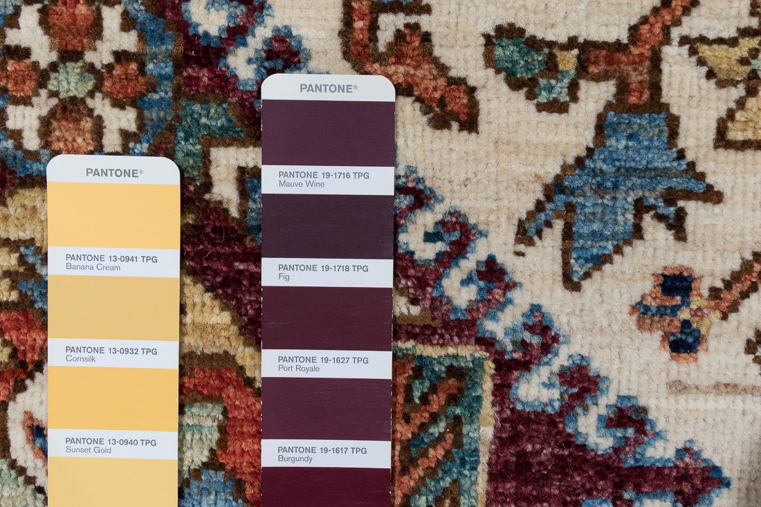 PANTONE shades: We do our best to find the closest match to one or multiple colors in the rug. The shade card we choose may not always be the perfect one, but we do our best (it’s a lot of work)! At times we may show multiple shade cards so you can get a better sense of color. Finally, when photographing rugs from the same group (shipment, collection, SKU, etc.) we will often use one or two shade card(s) so that you can get a good sense of the coloration. Hope you enjoy viewing our beautiful rugs!